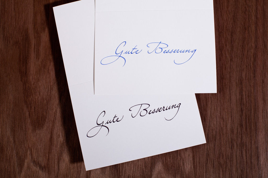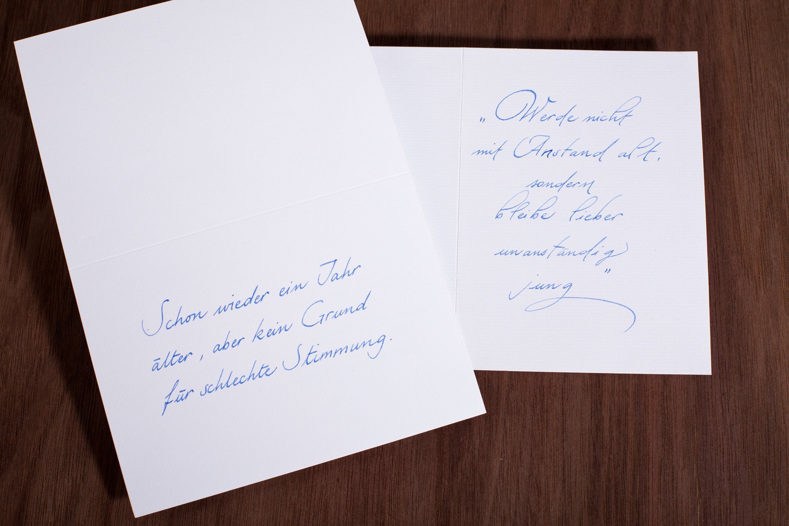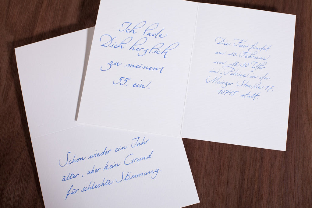 - Original handgeschriebener Text mit blauer, schwarzer, roter oder goldener Füllertinte nach deiner Vorgabe im Texteditor (maximal 250 Zeichen)